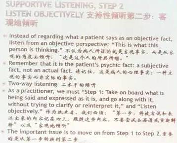我们看看第二步,客观倾听。下一步需要做的是专注地去倾听病人的话语。而且要同时能够保持一种病人心里事实的视角。作为一种实际的倾听方式,我们会接受采取病人的视角和思维。然后将病人的话放进括号里,例如这是他的所思所想,以及这是他正在体验到的。并且要同时能够采取一种视角。即从一定的距离之外来看待这个人。如果要我来描述一下这种立场,就是要认真去倾听他的陈述,在倾听的同时还要私下在头脑中加一句,这一定是他所思所想,是他体验到的事情,这会稍稍让我们跟他离开距离。