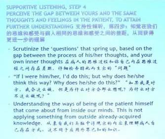 那么,我们来看看支持性倾听第四步,知觉在我们的思维与感受,与病人相同思维与感受之间的差距,从而获得进一步理解。在第四步倾听中,实际上就是在连接一种分裂的视角,这意味着在照原样知道病人感受时,也要密切审视他们想法感受与自己的差异。这种倾听模式中,我们对病人的感受与情绪要保持警觉,并且还要触及到自己和他人共通的那些感受与想法。同时也需要自觉到这些共享的感受之中存在细微的差距。在头脑中,此时要维持第三者我的姿态来审视病人的想法,和我们自己与病人共通的那些想法。