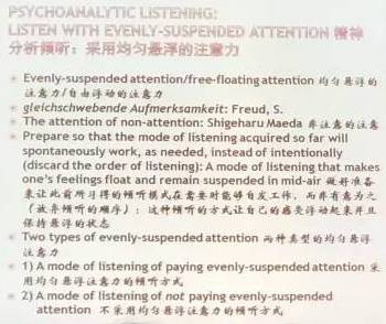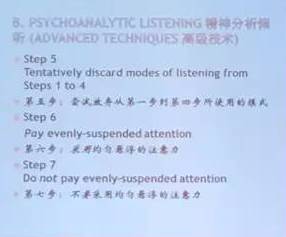 如果我们再来看一看对这种模式的不同描述,我们会发现弗洛伊德在同一篇文章里也提到过一种不一样的描述。我们来看一看这段话,他只是不要将自己的注意力指向特殊的事物,而是面对你所听到的倾诉时为一种悬浮的注意力。另外方面,又被陈述为平等关注一切。我自己把倾覆的注意力为包括两种倾听方式,我之前说过弗洛伊德的表述也包括这两种实践方式。弗洛伊德说不要将自己注意力指向特别的事物,他又说要平等关注一切,这实际上就是实践,一方面要使用均匀悬浮的注意力,同时又使用另外一种不采取悬浮注意力的倾听方式。每一种方法都有如下的步骤,下面再来精神分析倾听的第六步。即采取均匀悬浮注意力的方式来倾听。