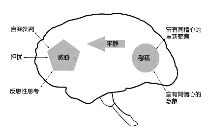 通常的分析、联想、认知技术就会在这里失效。(精神分析技术是咨询师涵容那些内摄的批评、攻击、羞耻,等待来访者重新借助咨询师来体验先前事件/重构记忆/重新体验情绪感受/活化被阻断的身体感受)。对他们来说,共鸣、安全、温暖的感受是很难获得的。慈悲的相关研究认为:共鸣、安全、温暖的情绪感受是和系统、平静感的记录、对平静感作出反应的能力一起发展而成的。CFT推测,这些高度羞耻和自我批评的人,他们是无法理解这些情绪调节系统的,在他们的经验感受和思维中,占主导地位的是“威胁”的情感系统。