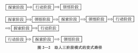 虽然从探索到领悟到行动,似乎是直线前进的,但实际助人中并没有这么顺利, 三个阶段并不是截然分开也不是按序进行的(图2-2 表示基本模式的各种变式) 。在助人过程中,助人者和当事人有时候会转回前一阶段或跳跃到下个阶段。例如,在领悟和行动阶段可能会跳回到探索阶段探索新发生的与当事人问题有关的事件。另外,获得领悟要求当事人重新探索新认识到的思维和情感。如果意识到当事人不愿意改变则需要回到影响其行动的障碍进行探索和领悟。如果当事人身陷危机需要危机干预时,则行动要在探索分析之前。例如, 一个由厌食症引发身体疾病的当事人首先需要学习正确的饮食习惯,然后过一段时间才可能去探索导致庆食的动机。