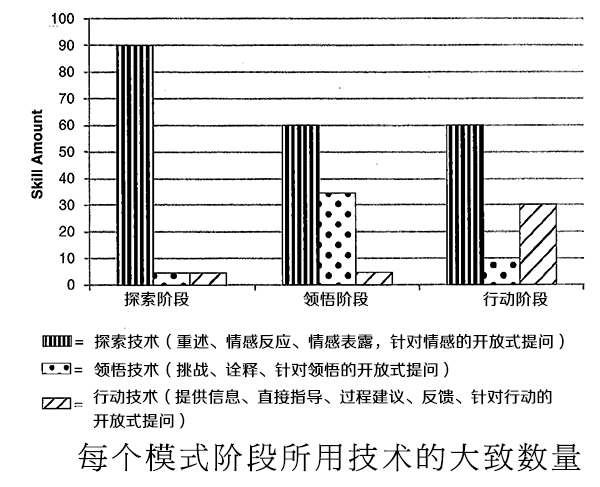 | 探索 | 专注、观察、倾听 探索想法 探索情感 | 非言语行为、轻微的言语行为 重述、针对想法的开放式提问 情感反映、情感表露、针对情感的开放式提问 |