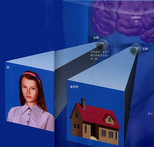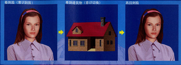 根据已做过的实验,我们可以确认在大脑侧面的“颞叶”的某个区域,这里的神经元在人们看到脸的时候活跃,而在另一个区域的神经元会在人们看到建筑物(正确地说是感觉到场所情景)的时候活跃。在每次双眼竞争导致看到的事物发生切换时,这些区域的活动也会发生切换。