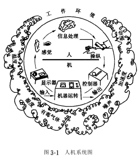 在人机系统中,人与机的沟通主要是通过感觉系统、神经系统和运动系统,人体的其他六个子系统,起到辅助和支持作用。机的运行状况由显示器显示,经人的眼、耳等感觉器官感知,经过神经系统的分析、加工和处理,将结果由人的手、脚等运动器官传递给机器的控制部件,使机在新的状态下继续工作。机的工作状态再次被显示器显示,再由人的感觉器官感知,如此循环直至中间任何环节中断而停止。人和机的沟通还受外界环境的影响。人机系统如图3-1所示。在人机系统中人与机器及环境相互适应,显示器、控制器的设计符合人的感觉器官、运动器官的生理特性,才能建立安全高效的人机系统。