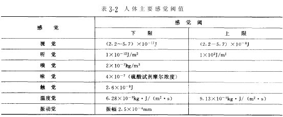 刺激包括刺激的强度、作用时间和强度时间变化率三个要素,将这三个要素作大小不同组合可以得到不同的刺激。能引起感觉的一次刺激必须达到一定强度,能被感觉器官感受的刺激强度范围称为感觉阈。刚能引起感觉的最小刺激量称为感觉阈下限,能产生正常感觉的最大刺激量,称为感觉阈上限。刺激强度不能超过刺激阈上限,否则,感觉器官将受到损伤。人体主要感觉阈值见表3-2