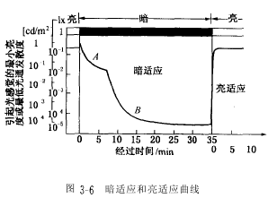 1)人眼的构造:机体从外界获得的信息中85%以上来自视觉,因此,在感觉器官中视觉占有重要地位。视觉是由眼、视神经和视觉中枢共同完成,眼是视觉的感受器官,眼睛的解剖见图3-2。眼球是一个直径大约23mm的球状体,眼球的正前方有玻璃体和一层透明。组织叫角膜。光线从角膜和玻璃体进入眼内,视觉的屈光能力主要是靠角膜的弯曲形状形成的。眼球外层的其余部分是不透明的虹膜。虹膜在角膜的后面,与睫状肌相连接。虹膜中央有一圆孔,叫瞳孔。瞳孔借虹膜的扩瞳肌和缩瞳肌的作用能够扩大和缩小。瞳孔后面是晶体。睫状肌控制晶体的薄厚变化,以改变屈光率。视网膜位于眼球后部的内层,是眼睛的感光部分,有视觉感光细胞--锥体细胞与杆体细胞。视网膜中央密集着大量的锥体细胞,呈黄色,叫黄斑。黄斑中央有一小凹,叫中央窝,它具有最敏锐的视觉。在视网膜中央窝大约3视角范围内只有锥体细胞,几乎没有有杆体细胞。在黄斑以外杆体细胞数量增多,而锥体细胞大量减少。视网膜中央锥体细胞的数量决定了视觉的敏锐程度,视网膜边缘的杆体细胞主要在黑暗条件下起作用,同时还负责察觉物体的运动。来自物体的光线通过角膜、玻璃体、瞳孔、晶体,在视网膜的中央窝。视网膜的锥体细胞及杆体细胞接受光刺激,转换为神经冲动,经由视神经传导到各视觉中枢。