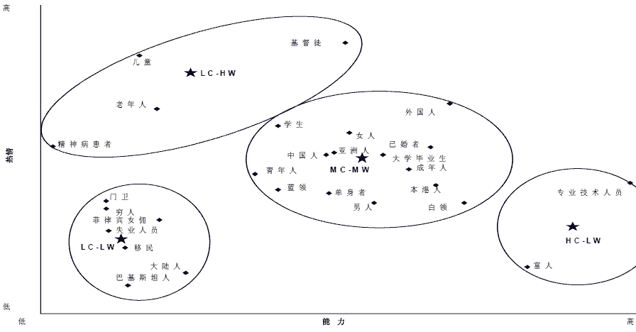 吃救济者亚裔穷人学生男同性恋白人富人残疾人 弱智者专业技术人员 女人 蓝领 老年人无家可归者中产阶级男人 热 情 能 力 低 低 高 高 LC-HW HC-LW LC-LW HC-HW犹太人印第安人青年人黑人 穆斯林西班牙裔MC-MW受过教育者基督徒