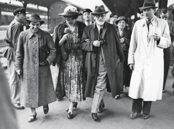 1938年,弗洛伊德(右二)从纳粹占领下的维也纳逃亡英国途中到达巴黎。图为他的小女儿安娜(左一)、希腊王子乔治的妻子玛丽·波拿巴公主(左二)以及波拿巴公主的儿子彼得王子(右)