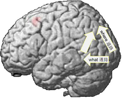 人脑在执行顿悟性的组块破解任务时背、腹侧通路调控连接增强的示意图. 箭头表示了在完成组块破解任务时,视觉信息加工的腹侧(what)通路、背侧(where)通路以及腹侧通路终端到背侧通路终端之间的调控连接都明显增强。