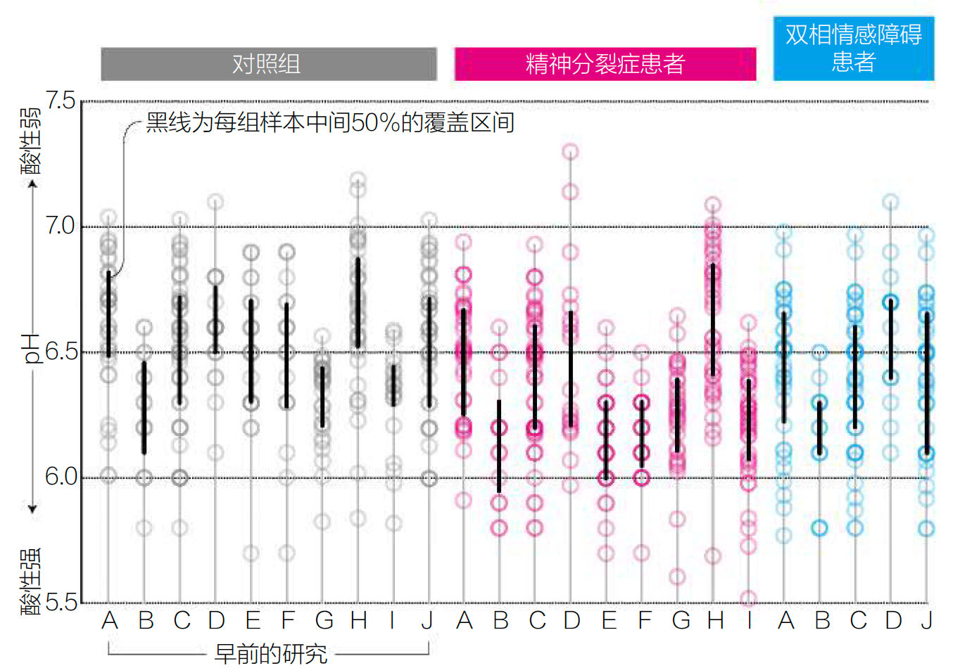 研究者分析了10个研究的数据,比较了精神分裂症、双相情感障碍患者和健康人死亡后大脑的酸性。总体看来,精神疾病患者大脑pH值的中列数比健康人低,这说明他们大脑中的化学成分更偏酸性。