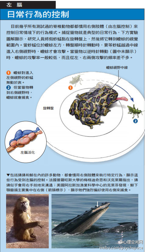 人类的左脑掌管了最重要的心智特征──语言,并控制了灵巧的右手;右脑则使人类具有感知物体的空间位置等能力。40年前科学家都相信,惯用右手以及使用特定脑半球来处理空间关系的特性,就和语言一样,是人类独有的,其他动物并没有左右脑特化的现象。