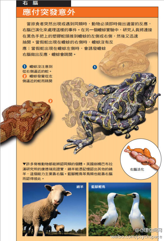 ■五亿年前脊椎动物演化出来时,可能已经具备左右脑特化的现象。■最初左脑偏重处理固定的行为模式,右脑负责侦测并反应突发的刺激。