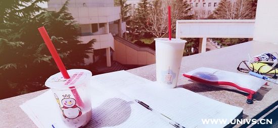 美梦被一阵谈话给吵醒,原来实验室临时调了大三的实验,恰好我还有点小懒,不如去晒着太阳,站着背会书吧。午后的阳光倾洒在我的奶茶上、眼镜上、课本上,连知识都显得那么波光粼粼,令人惊喜不止。在知识中遨游也不觉得孤独了,两个小时匆匆而过,而知识却深深的存在脑海。接下来要穿上实验服去做我的专业课——植物学实验了。