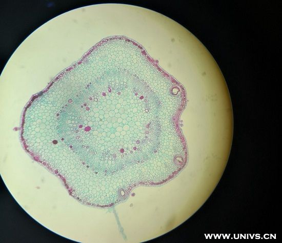 桌上放着各种植物的茎的切片,在不断的移动载玻片、调粗细准焦螺旋和物镜间。去观察每一个植物茎的构造,去分辨每部分名称。