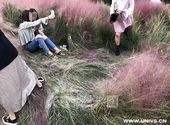 花海中,人密密麻麻,这些女孩们打扮漂亮,化着精致的妆,却也把花海的管理人员气哭了。 没错,这种粉黛草是从澳大利亚进口而来的,种植养护都要非常小心,因为它们一压就倒,倒了就死。明确的标志要求,禁止踩踏,可没人听。阿姨在一旁连喉咙都叫哑了,可这些“精致男女”还是跨进了草丛中,一屁股坐下,甚至直接躺在了粉黛草上。