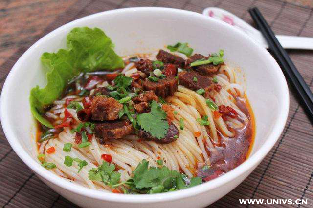 夹一把洁白、混圆、细长且有弹性的粉条,往竹筒子里一倒,再迅速放入开水锅中过一下,将水沥干后倒入提前准备好的筒子骨汤中,再舀一勺盖码,一碗润滑可口、风味独具湖南米粉就已做好。