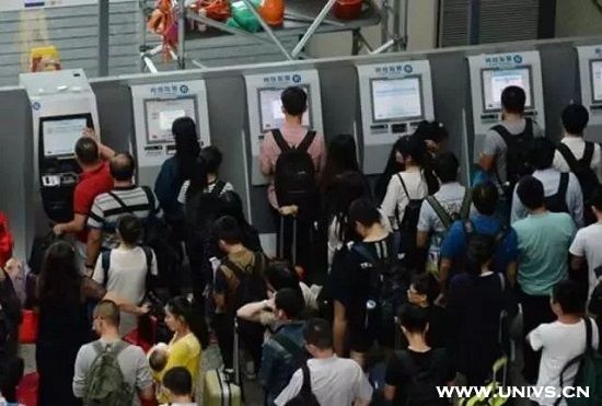火车站,自动取票机前排着长队,