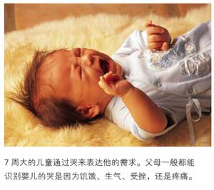 哭 哭是婴儿表达自己需要的最有效的方式,并且在某些时候是唯一的方式。某些研究区分了四种类型的哭(Wolff,1969):基本的饥饿哭泣(一种有节奏的哭泣,但并不是总发生在婴儿饥饿时),生气哭泣(另一种有节奏的哭泣,过多的空气被迫穿过声带),疼痛哭泣(突然地大声哭泣,并且没有前期的呻吟,有时呼吸困难),挫败哭泣(两声或者三声持续的哭泣,不会长时间呼吸困难)(Wood & Gustafson,2001)。