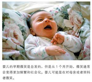 轻微的刺激(如轻轻地抖动,朝婴儿皮肤轻轻吹气)能够引起婴儿最早的非睡眠微笑。在第2 周,婴儿吃饱后会懒洋洋地笑;在第3 周,当警觉或者是注意到照料者说话和点头时,大多数婴儿会开始笑;在大约1 个月的时候,微笑通常会变得更加频繁且更加社会化;在第2 个月时,随着视觉再认的发展,婴儿对视觉刺激的微笑增多,如熟识的面孔(Sroufe,1997 ;Wolff,1963)。