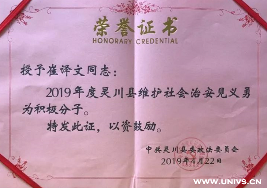 4月22日,广西灵川县政法委把一张荣誉证书颁发给了大学生崔译文,授予这位勇敢的女孩“见义勇为积极分子”荣誉称号。