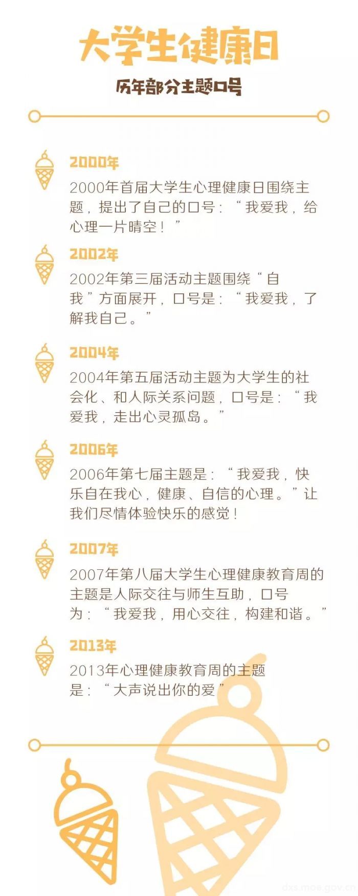 为引导大学生关注自身的心理健康,2000年,“5.25全国大学生心理健康节”在北京师范大学拉开帷幕,健康节取“5.25”的谐音“我爱我”,意为关爱自我的心理成长和健康,活动的主题是大学生人际交往和互助问题。 此后(2004年),教育部,团中央,全国学联办公室向全国大学生发出倡议,把每年的5月25日确定为全国大学生心理健康日。