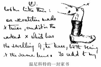 1910年,在温尼科特14岁的时候被送到了一所寄宿学校--剑桥的莱斯(Leys)学校学习。在那里,他如鱼得水,能够以全新的方式展示自己。没课的下午,他跑步、骑车、游泳、玩椒揽球、参加学校的童子军、交朋友、在唱诗班唱歌。每天晚上,他都大声给寝室的男孩们朗诵一则故事。他常常写信回家,每一封信都流露出他的活力和兴趣,并且向家中每一个人致上他的爱,包括女仆甚至猫。下图就是这个时期他曾写给父母的封信,图文并茂地呈现了他在活动中所受的伤(Rodman ,2003 , p. 29 )。